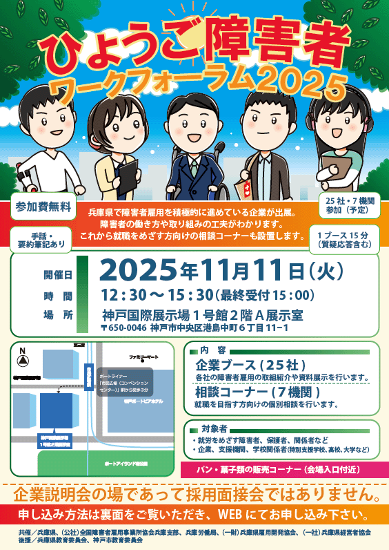 令和7年11月11日(火)昼12時30分から、全障協兵庫支部と兵庫県等の共催により、標記のワークフォーラムが神戸国際展示場において開催されました。