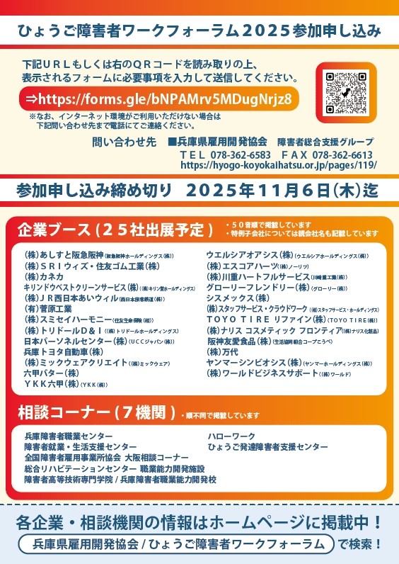 令和7年11月11日(火)昼12時30分から、全障協兵庫支部と兵庫県等の共催により、標記のワークフォーラムが神戸国際展示場において開催されました。